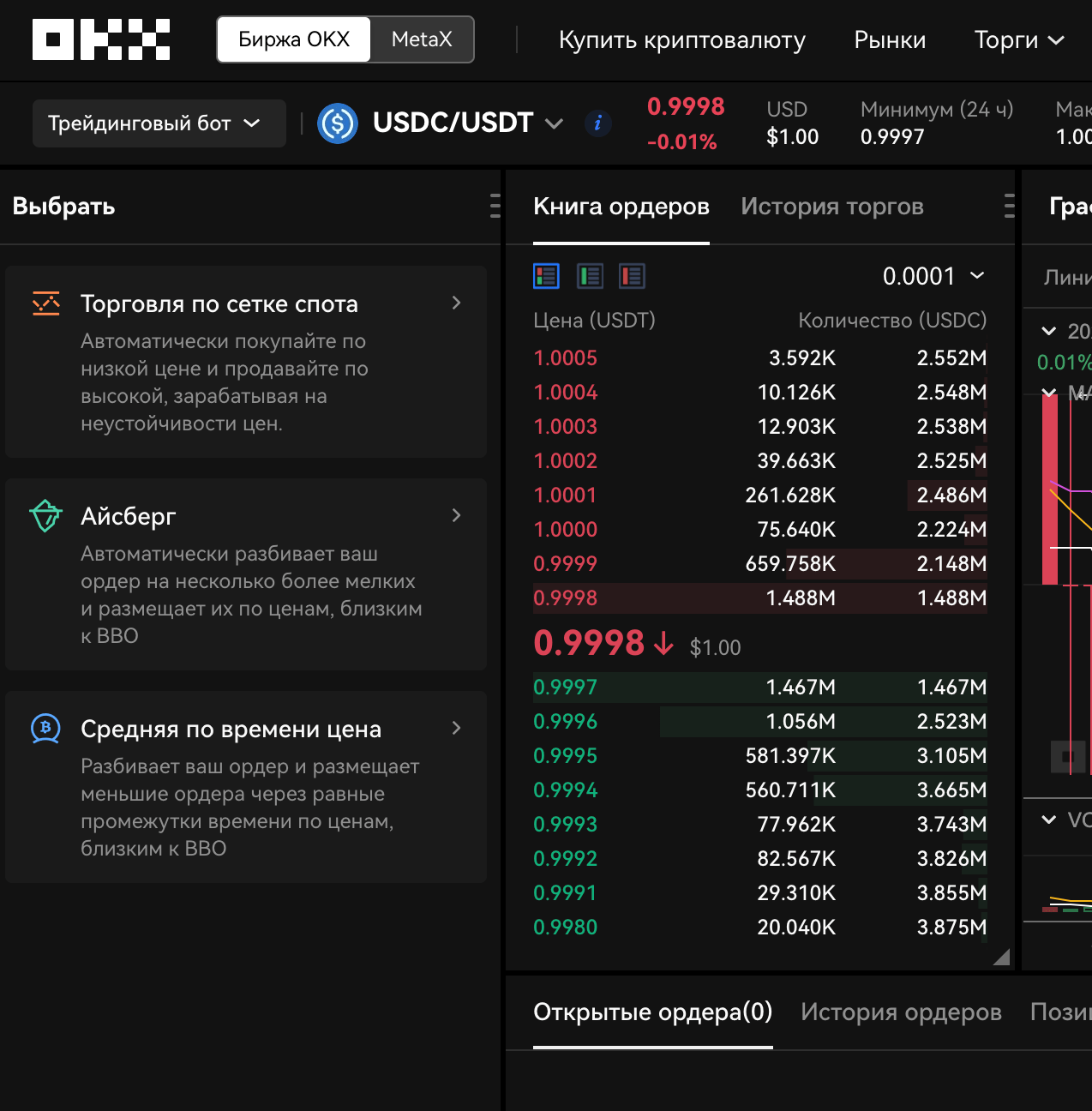 В данном случае торговля будет осуществляться в соответствии с разработанными алгоритмами. Всего их представлено 3: по сетке спота, айсберг и средняя цена по времени. Открывая бот, можно самостоятельно отрегулировать параметры до нужных значений и просто ожидать автоматического закрытия позиций.